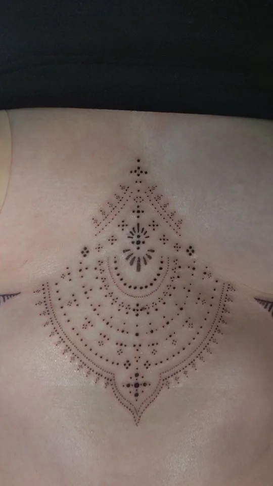 The people who gravitate toward my work are generally searching for something design-wise that is on a spectrum ranging between bold shapes and delicate elegant marks, good spacing, and flow. Whether that is purely geometric, ornamental, illustrative or a combination, I aim to achieve a sort of balance between fullness and emptiness, solid shapes and negative (skin) spaces, bold and elegant. There is a lot of detail, and yet we also embrace minimalism.
