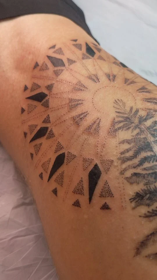I graduated Humboldt State University in 2011 with a BA in Studio Art, with an emphasis on painting. Throughout my life, I also studied Multimedia, Animation, and Graphic Design. I studied with professional artists abroad to further refine my work in painting and visionary art, working with various healing paths, before I was handed a tattoo machine and taught some basics in a bungalo in Venice Beach. ‘Self-taught’ with the help and inspiration of tattooer friends, I sought to work in a tattoo shop to further improve my skills, and have stayed with that path since 2017.